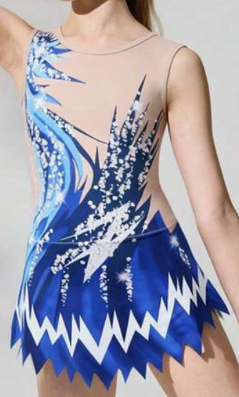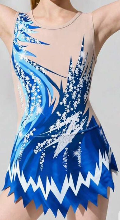 DRES za ritmično gimnastiko z grafičnim potiskom vzorca in okroglim izrezom in asimetričnim robom: številka 6, 8, 10, 12
